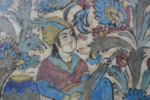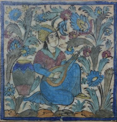 19th C OTTOMAN POTTERY TILE: Picturing musician in a flowering garden, 9 1/4'' square. From the George Lehner Collection.