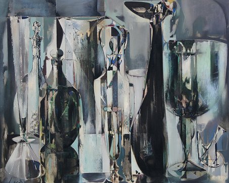 JACUS, Jean, (French, 1924-): Abstract Still Life of Decanters, OIL/C, 32'' x 39 1/2'', signed, dated, 1956, framed, 41 1/2'' x 48 1/2''. Small puncture, needs cleaning. Jacus attended Ecole des Beaux-Arts, 1954 hors concours designation for the Prix d la Jeune Peinture.