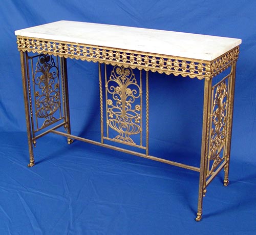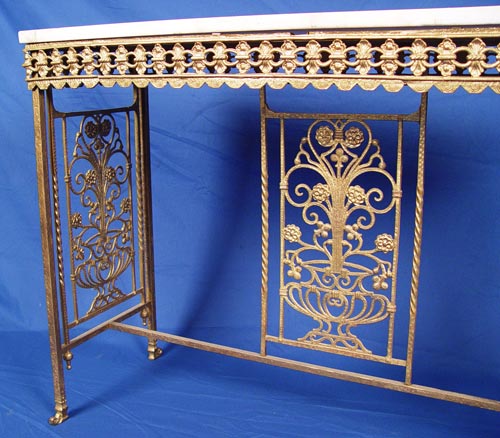 1920'S MARBLE TOP AND IRON HALL TABLE: Gilt wrought iron and gilt metal reticulated table base. White marble top. Measures 29 3/4'' high x 41'' wide x 15'' deep