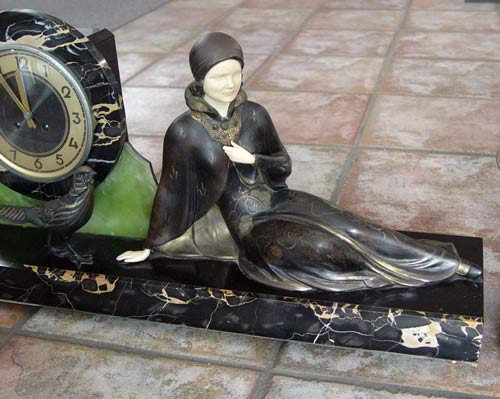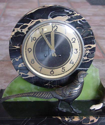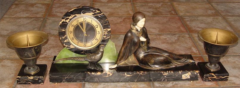 MURAT ART NOUVEAU FIGURAL CLOCK GARNITURE SET: Marble, patinated metal and green onyx with figure of a pheasant and a reclining woman with ivory face and hands. Marked on metal face Murat Laumur. Unmarked key and pendulum works, note missing key. Matching marble base garniture set. Clock measures 13 1/2'' high x 26'' wide x 6 1/2'' deep. Garniture measure 8'' high x 7 1/8'' top dia.