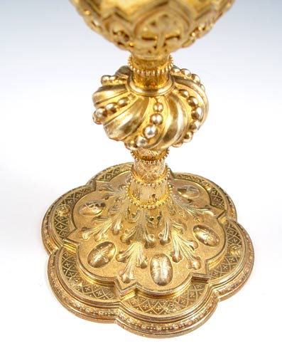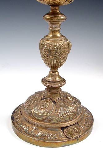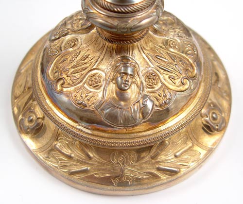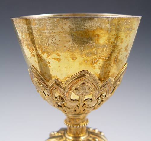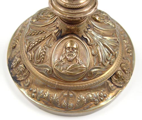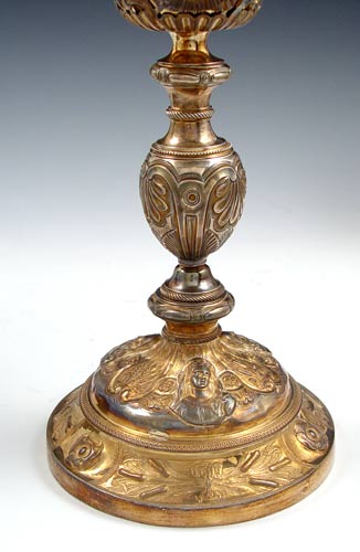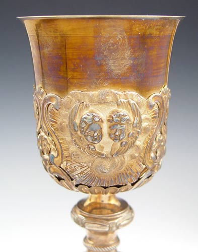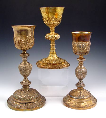 3 FRENCH STERLING RELIGOUS ALTAR CHALICES: All 3 hallmarked with French guarantee, no makers hallmark. Embossed and engraved designs of Jesus, Mary, putti, wheat, grapes and other Christian symbols. Measures 12'' high x 6'' base dia., 11'' high x 5 3/8'' base dia., 9 3/4'' high x 6'' dia.. Please note loss of vermeil wash. Approx 52 toy oz. overall.