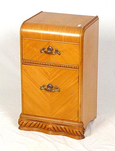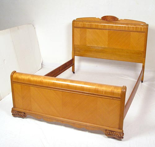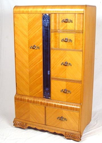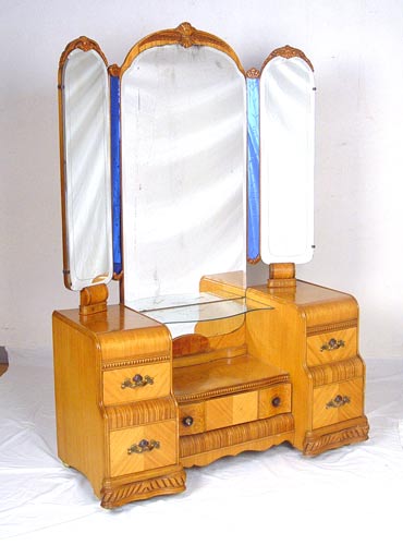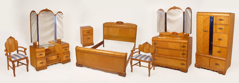 7 PIECE WATERFALL BLUE MIRROR GLASS 1940 ART DECO WATERFALL BEDROOM SUITE: To include BED (headboard measures 47 3/4'' high x 55 3/4'' wide, footboard 24 1/2'' high, note non matching bed rails) , DRESSER with Mirror (75'' high x 44'' wide x 22 1/2'' deep), VANITY with mirror and BENCH (33'' high x 23 1/2'' wide x 16'' deep), ARMOIRE (63 3/8'' high x 36'' wide x 22 1/2'' deep), ARM CHAIR (37'' high x 18 1/4'' wide x 16'' deep), and NIGHTSTAND (27'' high x 16'' wide x 14'' deep). Sold with original 1940 payment book from Miller & Dobrin Furniture Co., Passaic N.J.