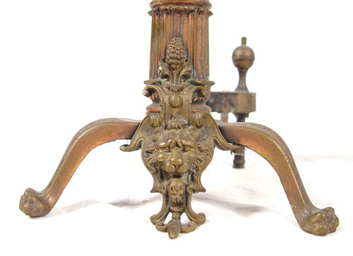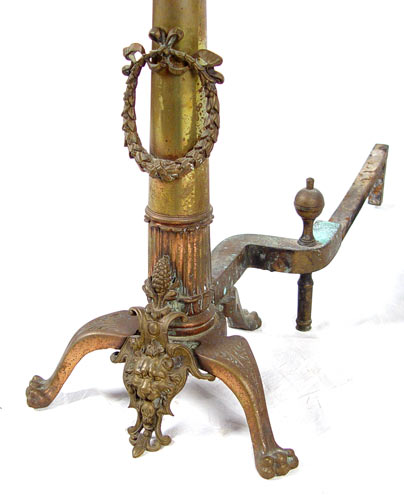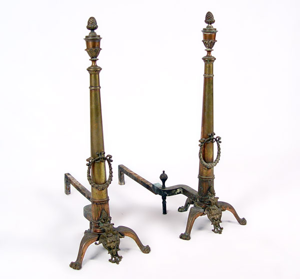 FRENCH REGENCY FIGURAL LION HEAD BRASS ANDIRONS: Brass and case iron with pinecone finials, wreaths, lion head and paw feet. Measures 28'' high x 10'' wide X 24 1/4'' deep. Note looseness.