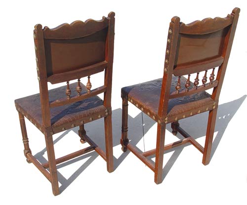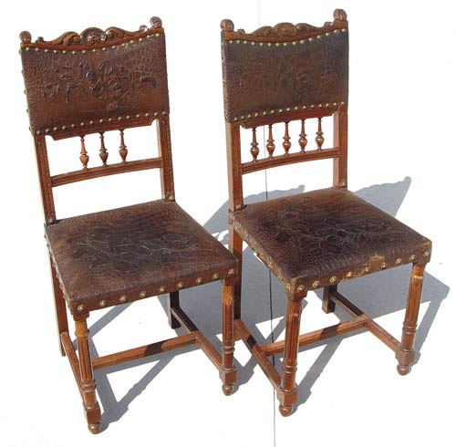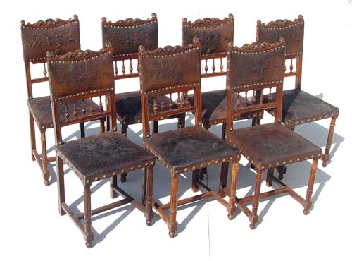 SET OF 7 JACOBEAN STYLE CARVED OAK SIDE CHAIRS WITH LEATHER SEATS AND BACKS: Leather is chased in a fruit design. The underside is marked in an indecipherable mark. 38''h. x 15'' x 16''.