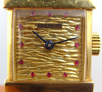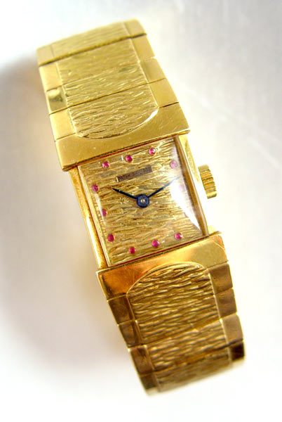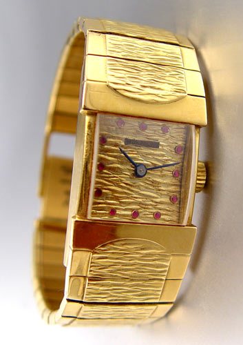 PATEK PHILIPPE WRIST WATCH 3409: Patek Philippe watch with attached band. Model 3409 was introduced in 1958 and halted in 1964. Watch and band feature bark finish, dial in watch with nice dome red (possibly ruby) markers. Movement runs and timing tape is provided. Movement caliber number 06-6. Movement serial number 0977698. Case is genuine Patek Philippe marked Patek Philippe 18k with reference number of 3409 and case serial number of 2622849. Dial is original and not refinished. 7 1/2'' long. Gross weight including movement is approx. 113.5 grams.