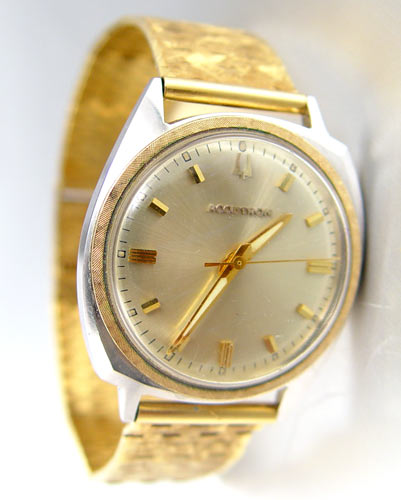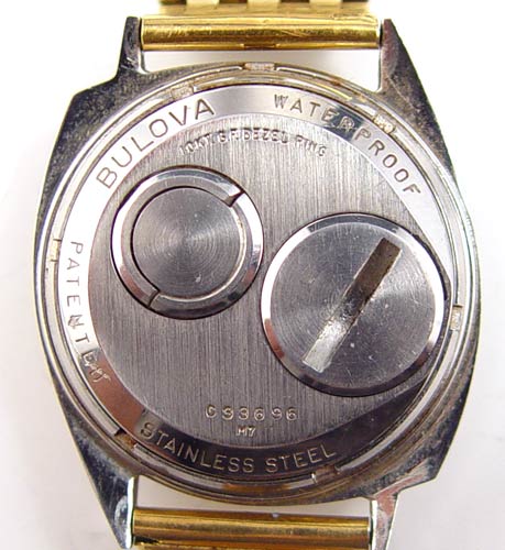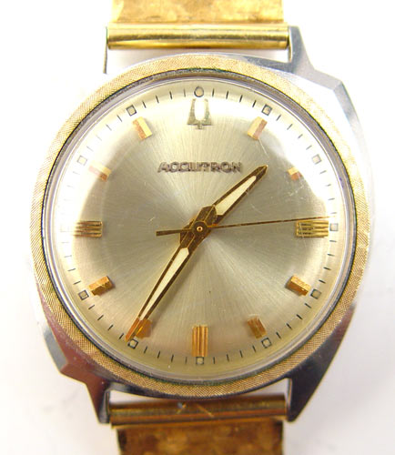 BULOVA ACCUTRON WRIST WATCH WITH 18K BRACELET BAND: Stainless steel Bulova Accutron. Round silver-tone dial with applied markers, acrylic crystal. The watch is not running. 18K yellow gold bracelet with swirled Florentine finish. Approx 7.5'' in length. Approx. bracelet weight is 35.0 grams.
