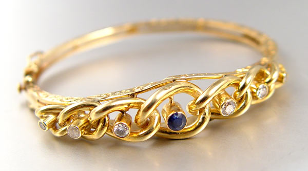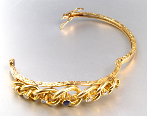 DIAMOND AND SAPPHIRE BANGLE BRACELET: 14K yellow gold engraved bangle bracelet with 6 round brilliant cut diamonds. Weight: .50 Ct. Approx. Rated SI in clarity and H-I in color. One diamond is chipped. Featuring One round mixed cut sapphire, approx. weight .25 Ct. The bangle has a Cuban link top. The sapphire and diamonds are bezel set. Locking closure with two figure eight safety clasps. Approx. 2.25'' diameter. Weight: 23.2 grams.