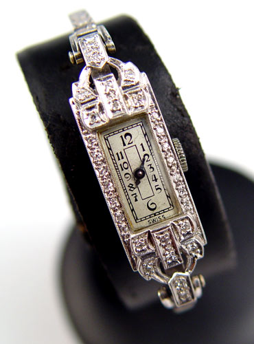 DECO PLATINUM AND DIAMOND WRIST WATCH: Platinum diamond Art Deco wrist watch. Rectangle silver-tone dial with painted markers. Glass Crystal. Swiss mechanical movement. The watch is running. 14K white gold diamond bracelet. Watch and bracelet contain 58 round single cut diamonds, total weight approx. .40 Ct. The diamonds average VS in clarity and H in color. The diamonds are bead set. Miligrain detail. Approx. 5 '' in length.