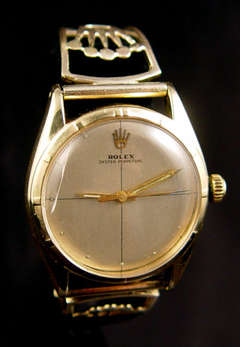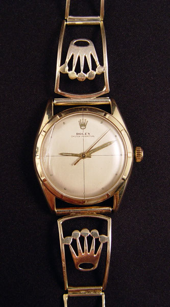 14k GOLD ROLEX GENTLEMEN WRIST WATCH WITH CUSTOM BAND: Gold case properly hallmarked on inside case back. Top portion of case original, however case number and serial number have been removed through detailing over the years. Case number inside case back is 6085. Movement is original Rolex with serial number of 25806. 14k gold band is custom made for this watch. Weight including works is 33.9 grams. Note cracked crystal, not running. Est. $2000/4000**