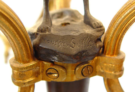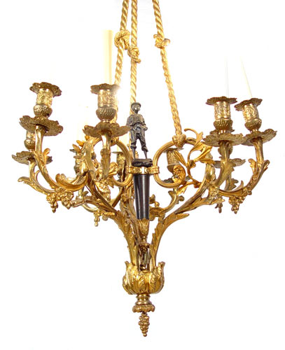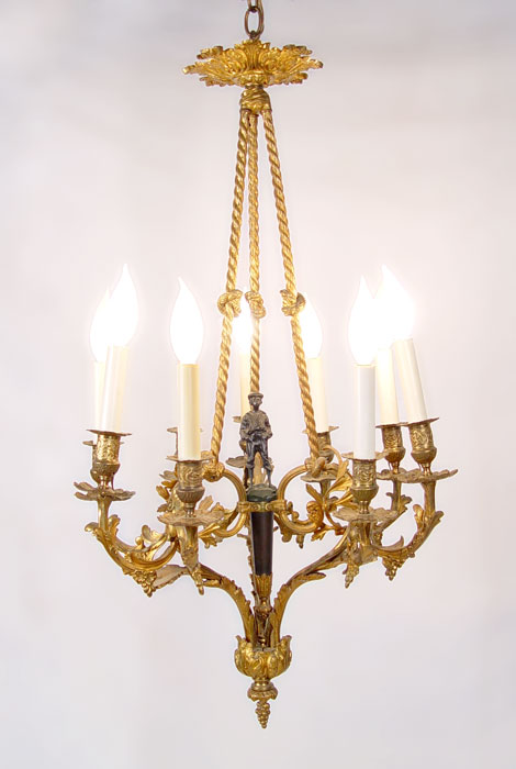 FRENCH MOUSSE SIFFLUER FIGURAL CHANDELIER: Gilt metal chandelier centering the statue titled ''Mousse Siffluer'', the Little Whistler. 9 lights grouped in sections of 3. Measures 32'' high x 17 1/2'' dia.