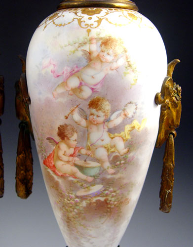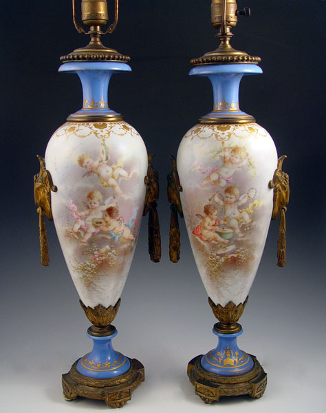 PAIR SEVRES PORCELAIN ARTIST SIGNED LAMPS: Hand painted image of cherubs at play. Signed Collot. Gilt metal rams heads and fittings with wear to the gold. Porcelain is 17'' tall, lamp is 31''h. overall.