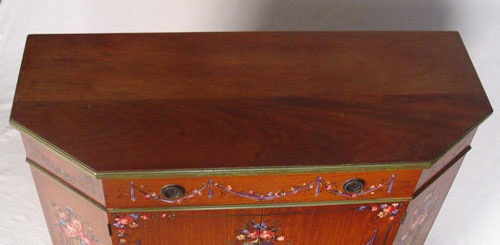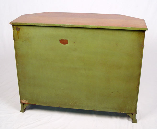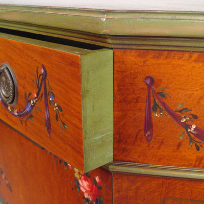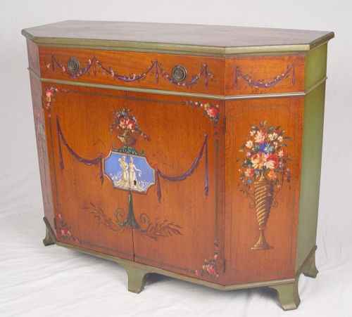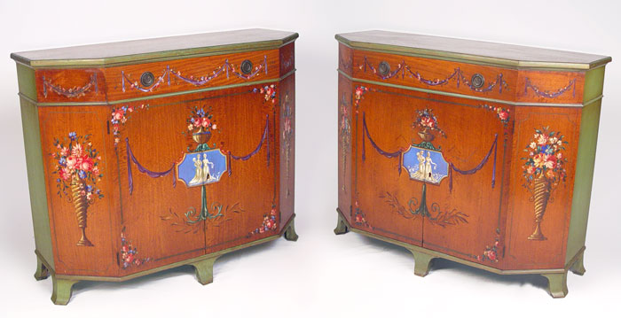 PAIR ELGIN SIMONDS PAINT DECORATED COMMODES: Full length drawer over doors, shelf interior. Measures 35 1/4'' high x 43 1/4'' wide x 17'' deep. Ca. 1920-30's. Elgin A. Simonds of Syracuse New York, One time partner of Gustav Stickley.