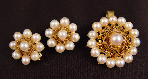 14K ETRUSCAN STYLE PEARL BROOCH & EARRINGS: 14K yellow gold Etruscan style cultured pearl brooch / pendant and earring set with 34 4.50 x 6 5.60 mm cultured pearls. Cream with slight rose overtone. Low luster. The pearls are peg and prong set. Earrings have hinged clip closures. Brooch has bar pin closure. Weight: 16.7 grams.