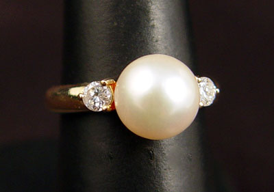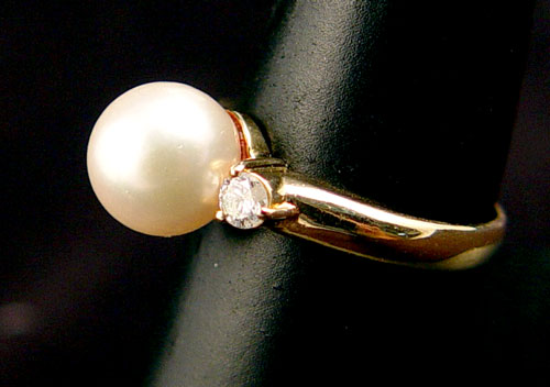 14K CULTURED PEARL AND DIAMOND RING: 14K yellow gold ring with one 9.00 mm cultured pearl. White with slight rosy overtone. Medium luster. Set between 2 round brilliant cut diamonds. Total weight: .25 Ct. Approx. Rated I1 in clarity and H-I in color. The pearl is peg set. The diamonds are prong set. Weight: 4.6 grams. Size: 7.5