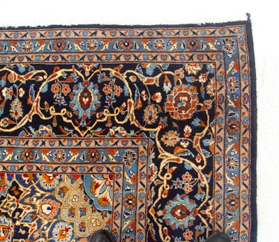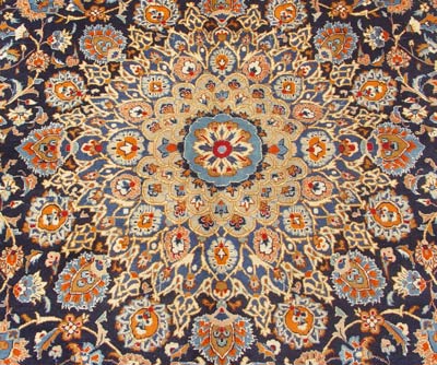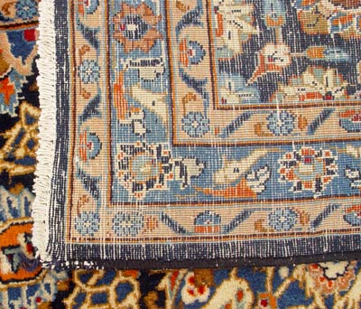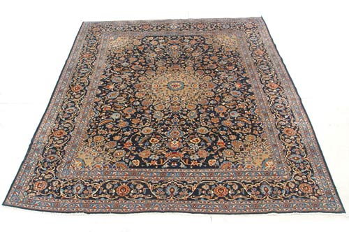 HAND WOVEN MID-EASTERN CARPET: Overall floral pattern on black ground with central medallion of ecru, lighter blue borders, approx. 12' 8'' x 10' 9''.