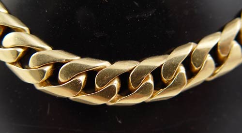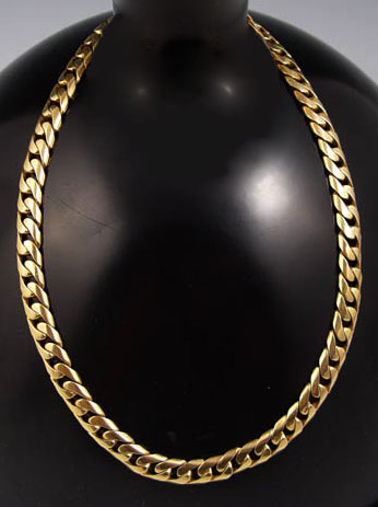 14KT GOLD LINK CHAIN NECKLACE: Heavy yellow gold chain, 18'' long, 5/8'' wide. Men's or women's. Approx. 90.8 grams.