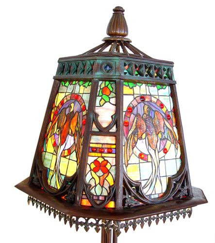 LEADED GLASS TORCHIERE FLOOR LAMP: 6 light with slag glass shade depicting birds. See next lot 1116 for match. Approx. 87''h. overall, shade 24'' square