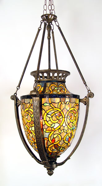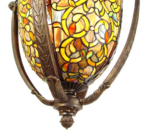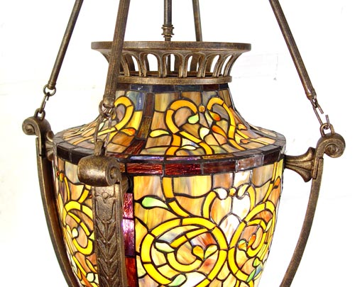 LEADED GLASS PENDANT CHANDELIER: Contemporary hanging light with old world charm. Leaded glass with patinated metal. Excluding the chains the light hangs 40''.