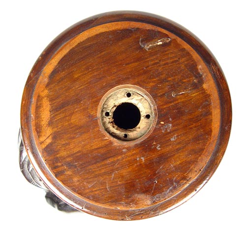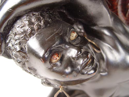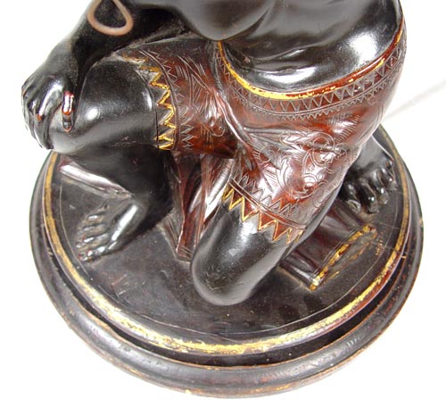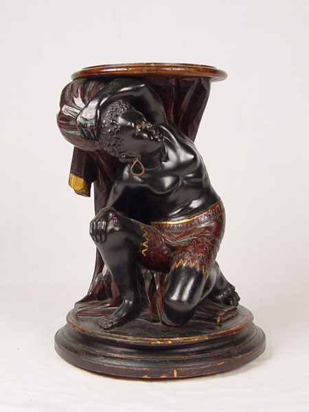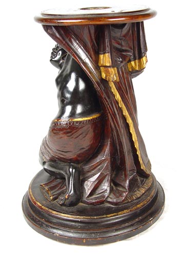 FINELY DETAILED CARVED WOOD BLACKAMOOR PEDESTAL STAND: Young Blackamoor figure carved as to appear to be holding the weight. Original gilt and painted finish. Drilled partially down the center. 13 3/4'' dia., top is 10'' dia.