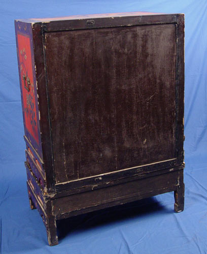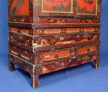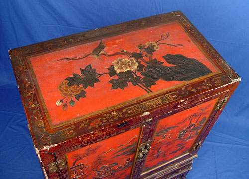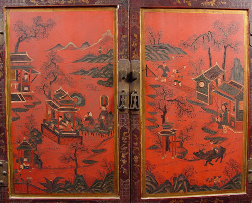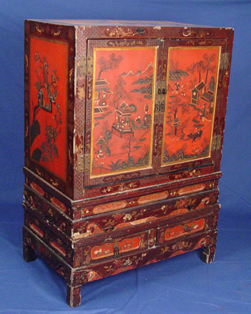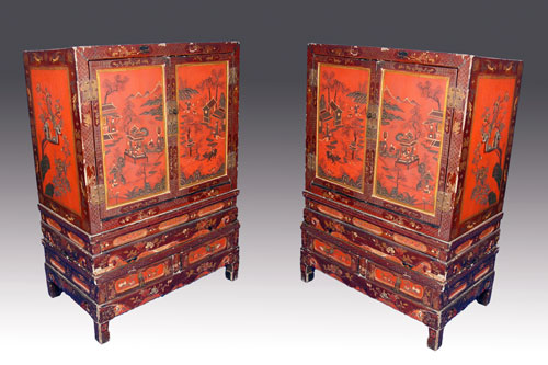 PAIR CHINESE RED LACQUER CABINETS ON STANDS: Ca. 1859-1880. 48''h. x 38'' wide.