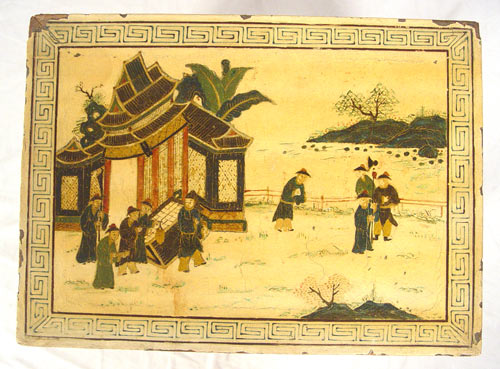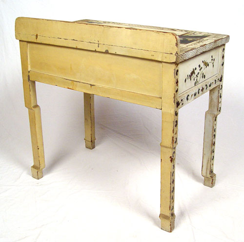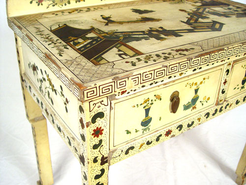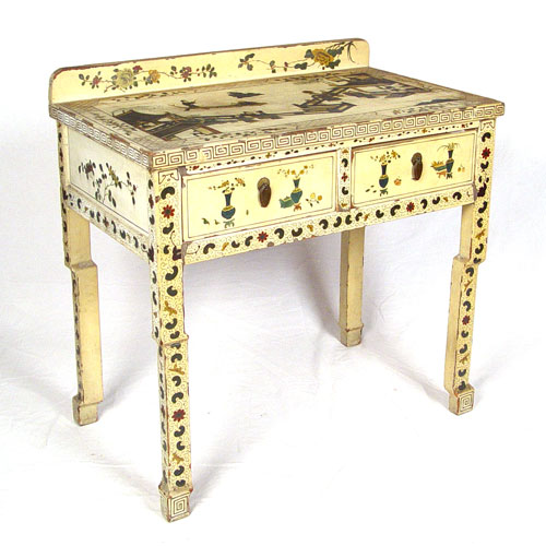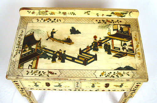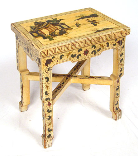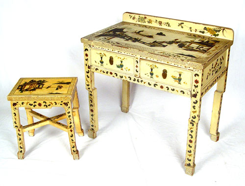 WHITE CHINOISERE WRITING TABLE AND STOOL BENCH: Table measures 33 1/2'' high x 33 1/2'' wide x 20 1/4'' deep. Bench measures 19'' high x 16 3/4'' x 12''. Comes with upholstered pillow with tassels.
