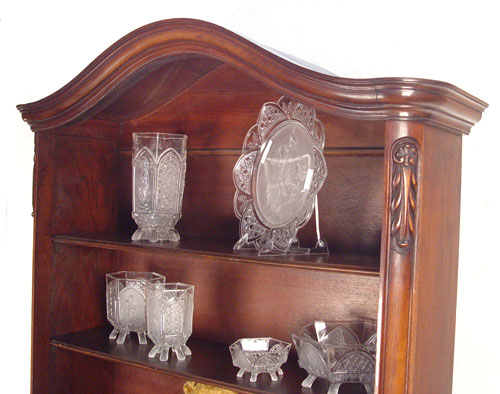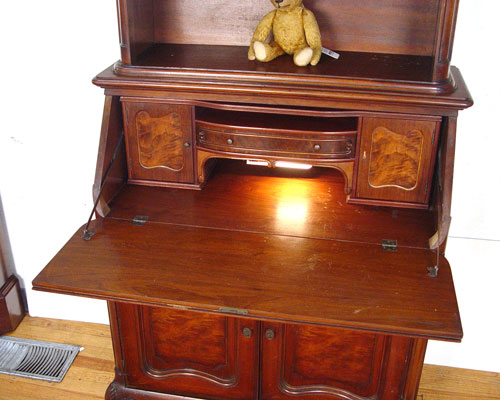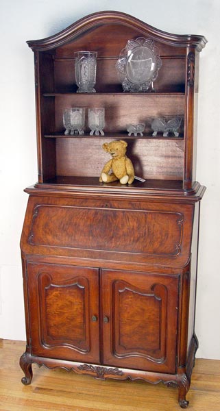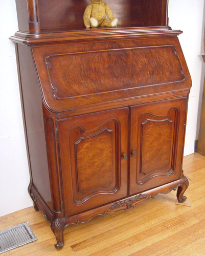 COUNTRY FRENCH STYLE SECRETARY BOOKCASE: Open bookcase over a slant front desk. Open the lower cabinet doors for pull out drawers. Applied molding, carved cabriole feet. Mid 20th C. 77''h. x 38'' x 16''.