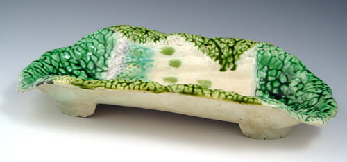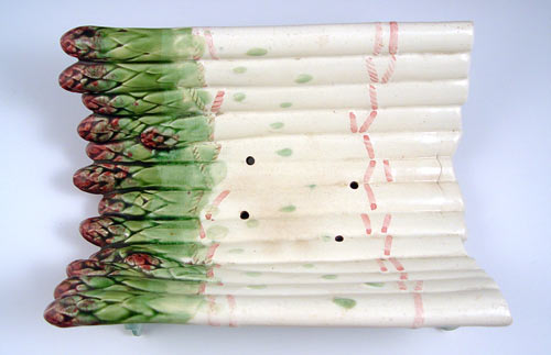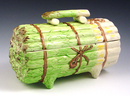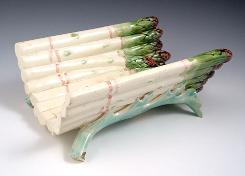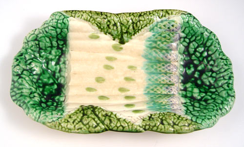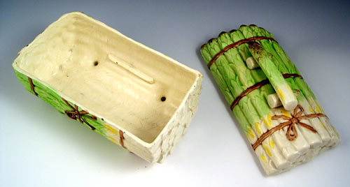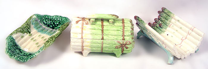 3 MAJOLICA ASPARAGUS SERVERS: 1) French Salins pottery asparagus cradle, 14'' long, hairline visible only from the underside. 2) Covered dish in the form of tied asparagus. 7''h., 9.5'' long. 3) Asparagus cradle on leaf form feet, 10''l. Overall condition is consistent with age, discoloration, hairline and chips on feet.