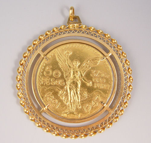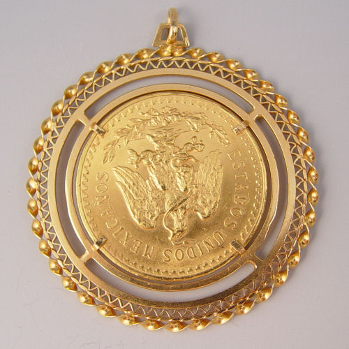 1821-1947 MEXICO 50 PESO GOLD COIN PENDANT: 18k yellow gold bezel set, weighs 17.9 grams. Coin weighs 37.5 gr, pure gold. 55.4 grams total weight. Coin measures 1 1/4'' dia, overall 2'' dia.