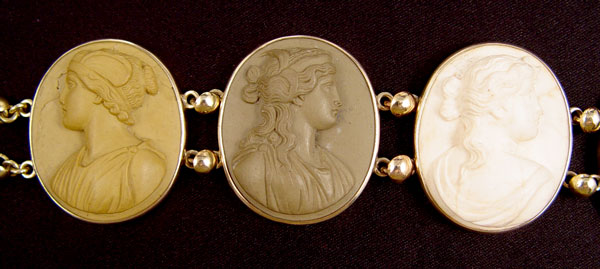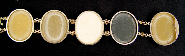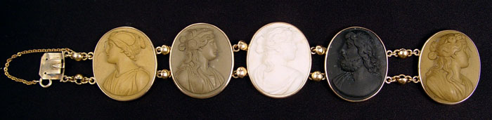 14K LAVA CAMEO BRACELET: 14K yellow gold bracelet with five 1.5 x 1.25'' oval shaped lava cameos depicting Grecian busts. Cameos are ochre, white and black in color. Cameos are bezel set. Box clasp and safety chain. Weight: 59.4 grams (including cameos). 7.50''