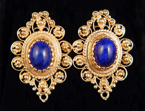 14K ETRUSCAN STYLE LAPIS LAZULI EARRINGS: 14K yellow gold oval shaped Etruscan style earrings with two 9.00 x 7.00 mm oval shaped cabochon cut pieces of lapis lazuli. The lapis is bezel set. Post and nut closures. Weight: 6.6 grams. Approx. 1'' in length.