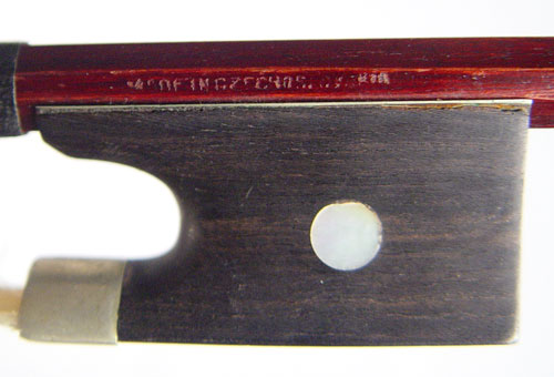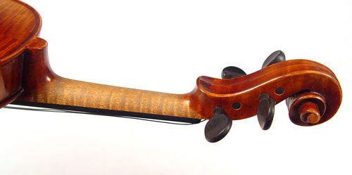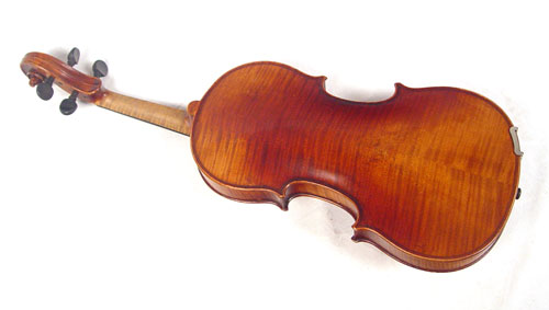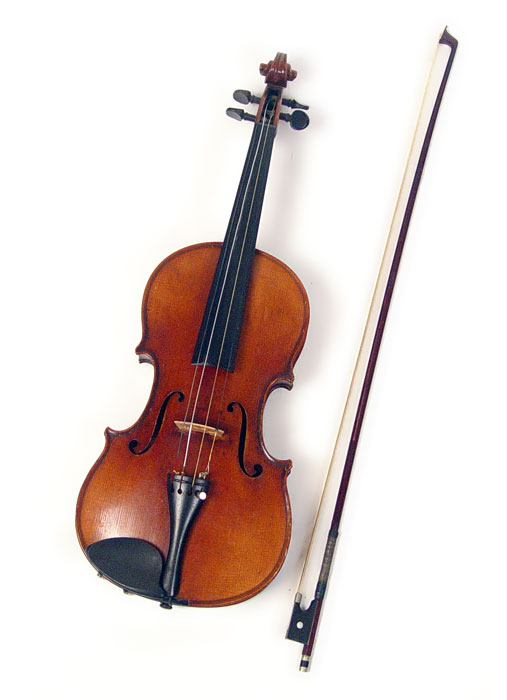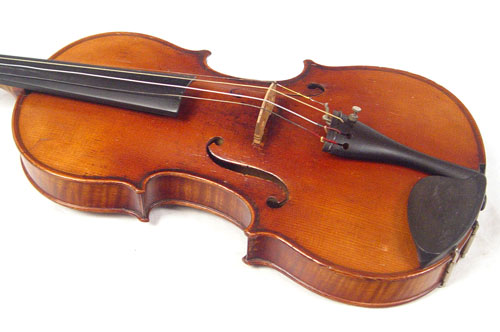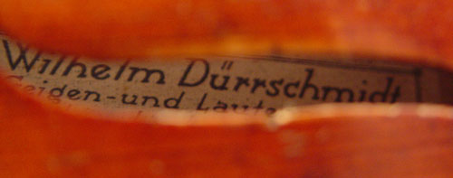 1932 WILHEM DURRSCHMIDT VIOLIN IN CASE WITH BOW: Labeled inside ''Wilhelm Durrschmidt Geigen-und Lautenmacher Markneukirchen i/Sa anno 1932''. Striped mahogany back and ribs. Back measures 14 1/4'', 24'' overall. Please note 2 small nicks to varnish on edge of rib. Also includes mother of pearl inlay bow made in Czechoslovakia, violin case with spare bridges, peg and other items.