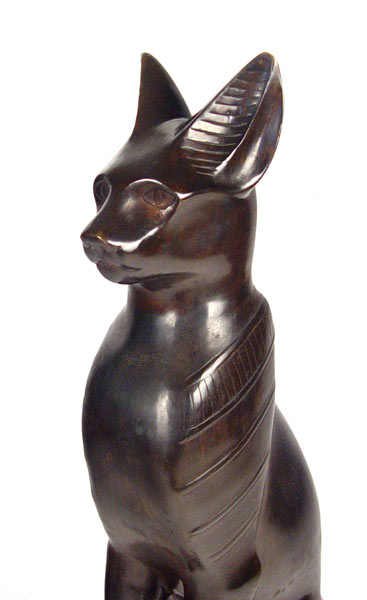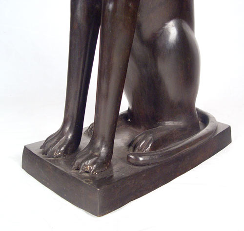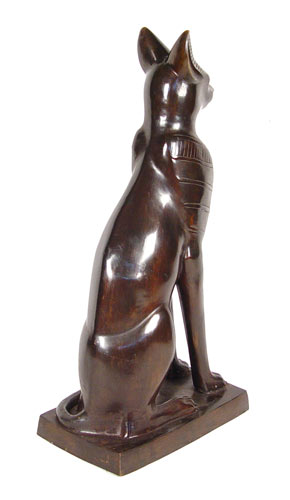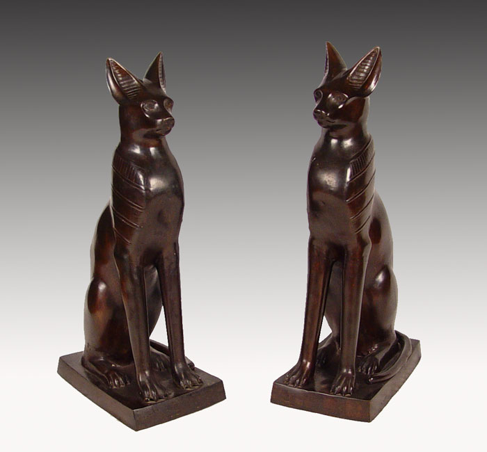 ALMOST 3 FEET TALL PAIR BRONZE EGYPTIAN REVIVAL DECO STYLE GUARDIAN CATS: Bastet, goddess of joy, protector of women, cats, and the caretakers of cats. Contemporary decorator statuary. 34'' tall, base is 17'' x 10.5''.