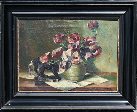 ILLEGIBLY SIGNED DANISH STILL LIFE PAINTING: Oil/Canvas, 15 1/2'' x 21 1/2'', framed, 21 1/2'' x 27''. Cracklure, missing paint, needs repair.