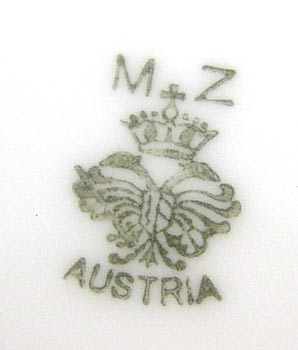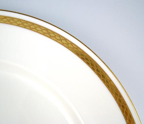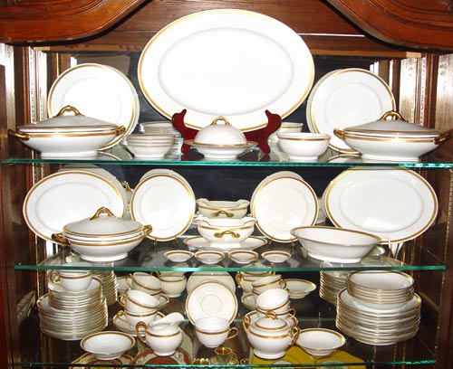 ELEGANT AUSTRIAN GOLD RIM CHINA SERVICE: Moritz Zdekauer, Altrohlau. 63 pieces to include a 18 3/4'' platter, 2 platters 13'', 2 oval covered vegetables, round covered vegetable, sugar, creamer, gravy boat, covered butter, 12 dinner plates, 12 salad plates, 6 bread plates, 6 dessert bowls, 6 cups, 5 saucers, and 6 butter pats.