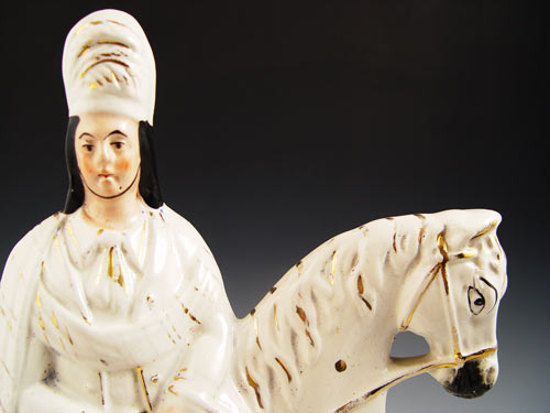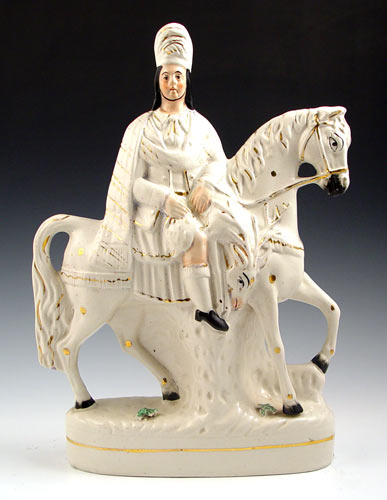 19TH C STAFFORDSHIRE HORSE AND RIDER: Unidentified Scottish horseman, gold gilt, flesh tone and black decoration, 15''h. x 9'' x 3 1/4''. Please note overall crazing and kiln flaw in back of right shoulder.