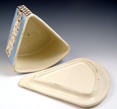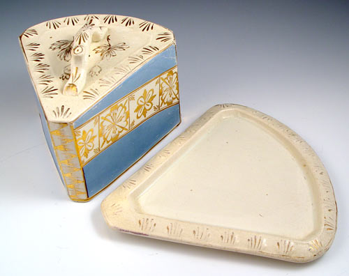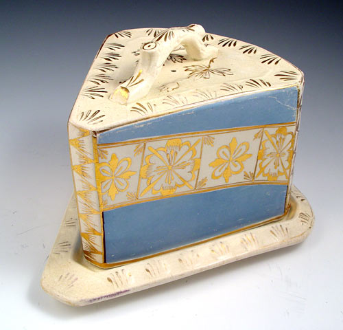 STAFFORDSHIRE COVERED CHEESE DISH: Wedge shaped covered dish, light blue and gold gilt decoration, twig shaped handle, overall approx. 7 1/2''h., 10 3/4'' x 10 1/2''. Generalized crazing, some scratching and wear to paint.