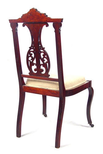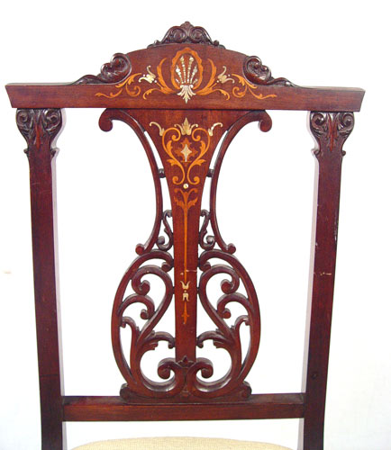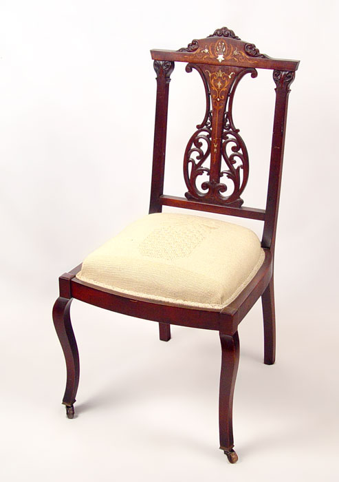 ART NOUVEAU MOTHER OF PEARL INLAY SIDE CHAIR: Pierce carved back with mother of pearl inlay. Monochromatic needlepoint with image of a pineapple. 36 1/2'' x 17'' x 16''.