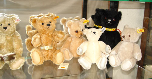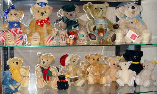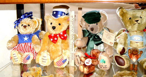 17 PIECE LOT OF STEIFF, HERMANN, GUND AND ALTHUS TEDDY BEARS: All 13 of the STEIFF bears have tags, are jointed and are as follows - 1-2) Mrs. First America and First American Teddy dressed in patriotic clothes, 13 and 16''. 3) 2002 Anniversary bear, 11''. 4) Night before Christmas bear with Santa hat, book and mouse, 11''. 5) Christmas bear with collar and bells, 13''. 6) 1909 reproduction teddy, 10 1/2''. 7) 10'' golden bear. 8 & 9 ) White bears, 9 and 10'', with Margaret Woodberry Strong Museum tag, 10) 9'' gray bear 11) Miniature 5'' black bear. 12) Miniature 7 1/2'' blue bear. 13) Mini 7'' brown bear wearing a Goebel medallion. 14) HERMANN bear is ''Luck of the Irish'' with shamrock on his foot, wearing a green hat and vest, original tag, 16''. 15) GUND white mohair bear for Danbury Mint, 12'' in seated position. 16) ALTHANS growling black bear, jointed, 13'' tall. 17) ALTHANS bear dressed in blue bid shorts.