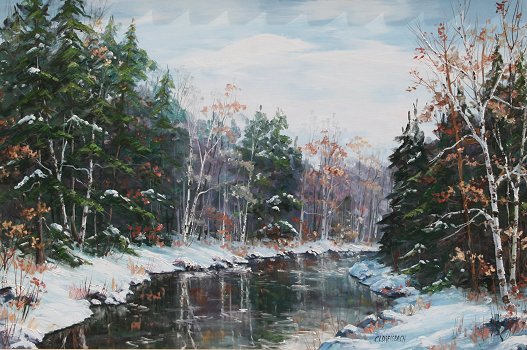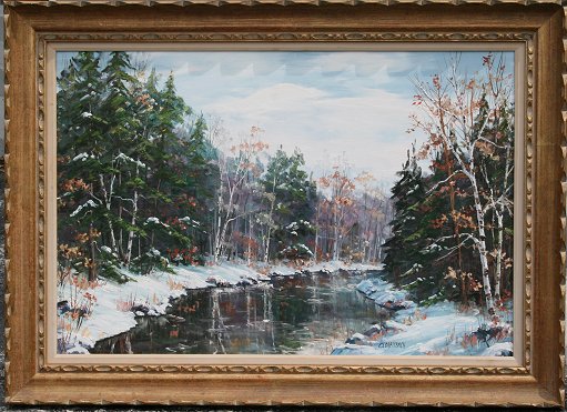 DREISBACH, Clarence I., (American, 1903-2001): ''Winter, Swiftwater Creek, Pocono Mountains, Penn.'', OIL/M, 24'' x 36'', signed, framed, 31'' x 43'', titled verso. Est. $1200/1800**