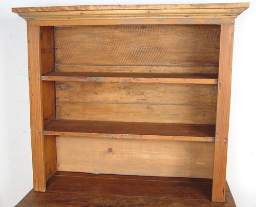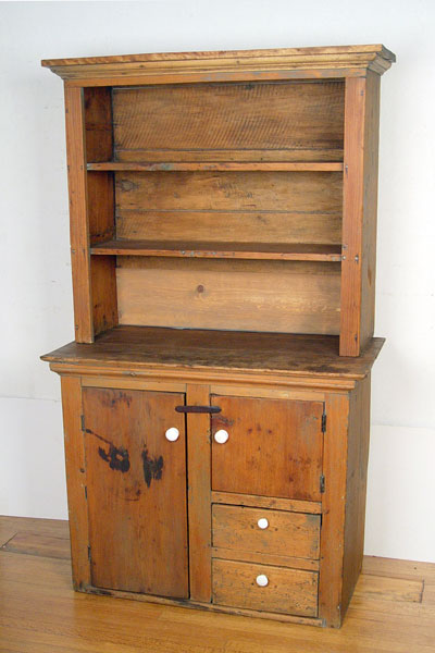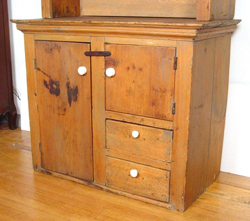 19th C FRENCH CANADIAN PRIMITIVE CUPBOARD: 2 part cabinet. Step back section is open shelving, base section has unusual one door next to door over 2 drawers. Paneled back has one panel replaced. Remnants of blue paint. 71''h. x 41'' x 21 1/2'' overall.