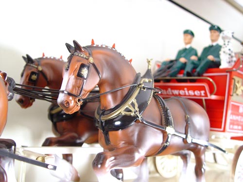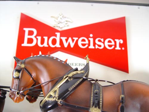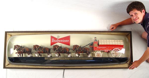 LARGE WALL MOUNT BUDWEISER CLYDESDALE TEAM ILLUMINATED SIGN: ''Worlds Champion Clydesdale Team''. Hinged lid to access light bulb. Please note peeling to outer frame, water spots on top frame, wrinkle to front sign, areas of mildew on plastic bubble. Light does not appear to be working. Measures 20 1/2'' high x 70 1/8'' wide x 11 1/4'' deep.
