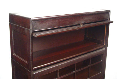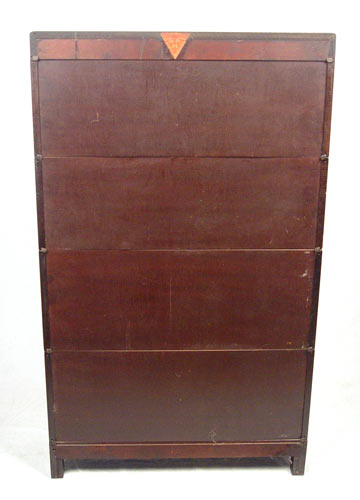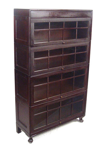 MAHOGANY MISSION STYLE LAWYERS STACKING BOOKCASE: Early to mid 20th C Grand Rapids furniture. 4 sections, pad feet. Alligator finish. Measures 57 3/4'' high x 34'' wide x 12 1/2'' deep.