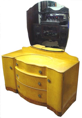 BIRD'S EYE MAPLE ART DECO LOW DRESSER / VANITY WITH MIRROR: Serpentine top and upper drawer over two bowed drawers between two doors hiding shelved space. Shaped back splash supports the shield shaped mirror. 61''h. x 48''w. x 20''d.