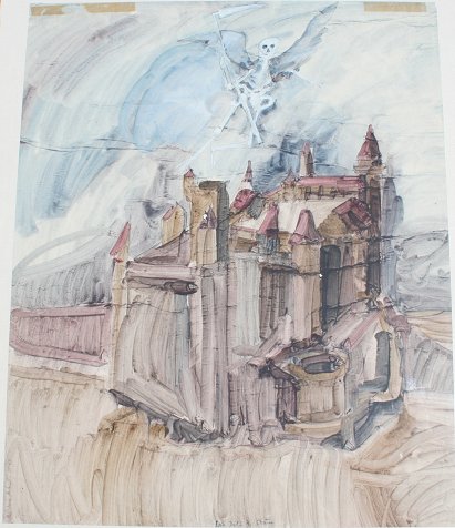 PARKER, Robert Andrew, (American, 1927-): ''Death over a Chateau'', W/C on paper, 33 1/2'' x 27 1/2'', signed, dated 11/20/63, framed, 38'' x 33'', Pro Grafica Arte and B.C. Holland labels verso.
