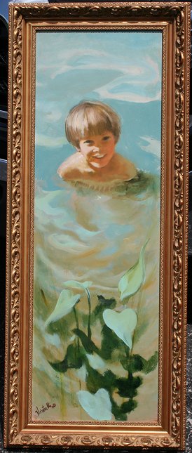 UTZ, Thorton, (American, 20th C.): Young Boy in Treading Water in a Pond, Oil/B, 42'' x 14'', signed, framed, 48'' x 19''. Est. $400/600**