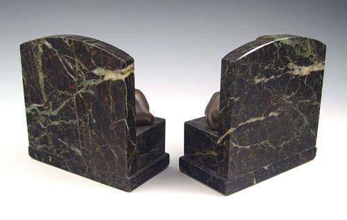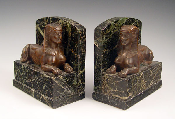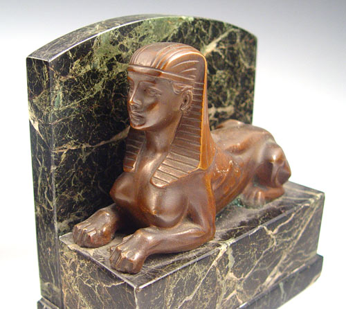 PAIR DECO ERA BRONZE AND MARBLE SPHINX FIGURAL BOOKENDS: Bronze sphinx, green vein marble base and back. Please note repair of marble. 6''h. x 5 3/4''.