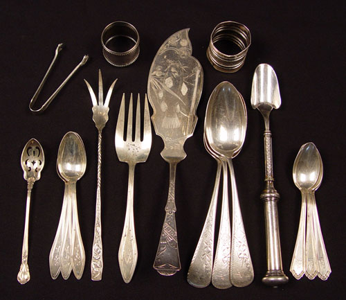 16 PIECES ESTATE STERLING FLATWARE: 16 assorted pieces to include 6 Towle and Alvin teaspoons monogrammed, 3 Gorham serving spoon 8 3/8'' monogrammed, Durgin chicken foot sugar tongs 3 1/2'', Derry engraved fish server 11 1/2'', Towle serving fork 7 1/2'', Gorham pierced spoon 5 7/8'', Towle asparagus fork 8 7/8'', MB Co. soft cheese server 9 1/2'' note condition, 2 napkin rings 1 5/8'', 1 3/8'' monogrammed. Approx 18.8 troy oz.