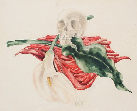 JOHANN(TARLETON), Magda (Maggie), (American, 20th C.): Skull Still Life, W/C, 17'' x 21'', signed, framed, 22 1/2'' x 27''. Magda was the wife of Jack Tarleton, credited with creating the Marlboro Man while working for Leo Burnett advertising. Former property of a family member.