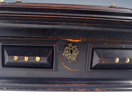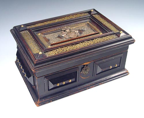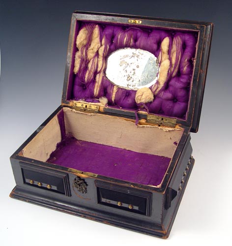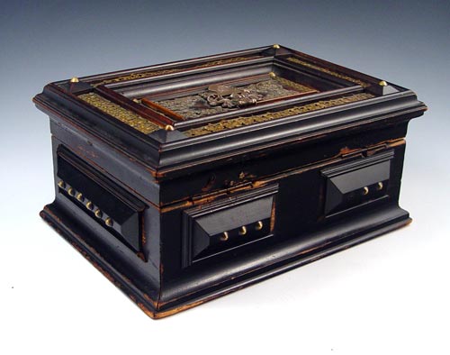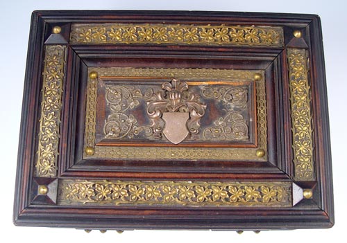 HERALDIC DESIGN JEWELRY BOX: Dark wood with brass decoration and heraldic shield and knights head. Remnants of purple interior and padding, mirror inside cover. Note overall condition. No key, looseness to lid. Measures 5 1/2'' high x 11 3/4'' wide x 8 1/2'' deep.