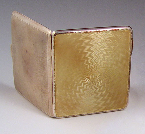 MAPPIN & WEBB ENGLISH GUILLOCHE CIGARETTE CASE: Yellow enamel guilloche front and stippled back. Birmingham 1933 date mark. Vermeil interior. Measures 3'' x 3 1/4''.